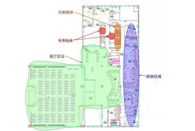 3、通风系统:厨房有专用排烟及补风风道,预留管道安装空间。建议预留2~3平米截面积的排风及补风接驳口或竖井。