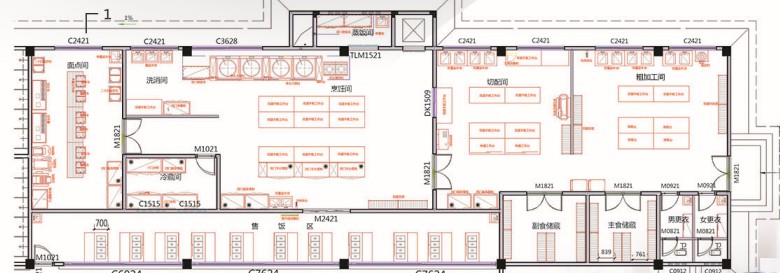 根据工作实际需要选用设备,按照工艺流程顺序布局设备,确保工作流程顺畅。设计中需要考虑人员运动、操作动作、物流顺序,按照工作流程流水线运作,减少无效劳动,使物流生熟分开、洁污分离。例如,粗加工间一进门就应设有菜架、冰柜,原料进入工作间,要有存放位置;其次就要有捡摘、清洗的工作台、洗菜池、垃圾车,以及净菜存放位的货架、运送的车辆。