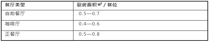 按餐位数计算厨房面积要与餐厅经营方式结合进行。一般来说,供应自助餐餐厅的厨房,每一个餐位所需厨房面积约为0.5-- 0.7平方米;供应咖啡厅制作简易食品的厨房,由于出品要求快速,故供应品种相对较少,因此每一个餐位所需厨房面积约为0.4平方米。风味厅、正餐厅所对应的厨房面积就要大一些,因为供应品种多,规格高,烹调、制作过程复杂,厨房设备多,所以每一餐位所需厨房面积约为0.5--0.8平方米。
