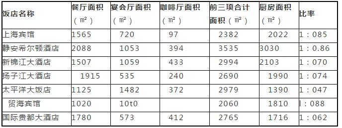 表2 为几家著名饭店餐厅、宴会厅、咖啡厅与厨房面积统计