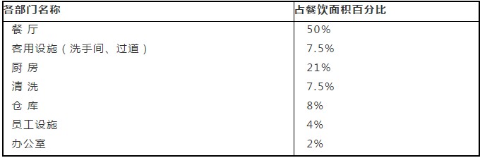 国外厨房面积一般占餐厅面积的40%一60%。根据日本统计,饭店餐厅面积在500㎡以内时,厨房面积是餐厅面积的40%一50%,餐厅面积增大时,厨房面积比例亦逐渐下降 。