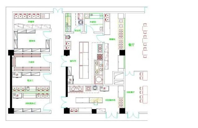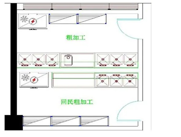 粗加工区:为满足卫生要求,对原料分别进行清洗和切割,不得与厨房其他区域交叉。