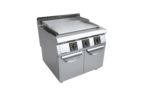 扒炉有台式和立式两种。台式扒炉有平扒炉和坑扒炉两种,大体结构相似,区别在:平扒炉表面是一块1~2cm厚的平整的铁板,四周滤油:坑扒炉表面是铁铸造的倒“T”字形铁条,都是用燃气、电或木炭作为能源。铁板预热后,再加油煎制,靠铁板传热,使被加热体均匀受热。平扒炉可用于肉类、海鲜加工,还可以煎蛋、炒面、炒饭等;坑扒炉用于肉类、海鲜等块状食材加工。台式扒炉体积小,具有方便、卫生、受热均匀的效果。