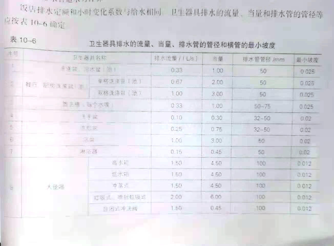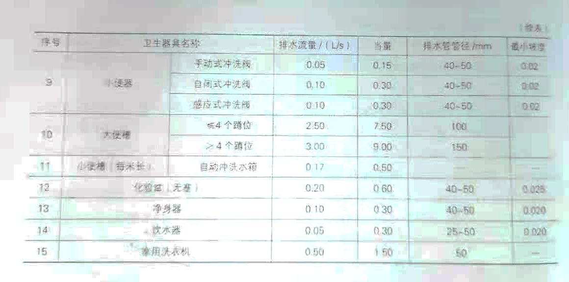 卫生器具排水的流量,当量、排水管的管径和横管的最小坡度