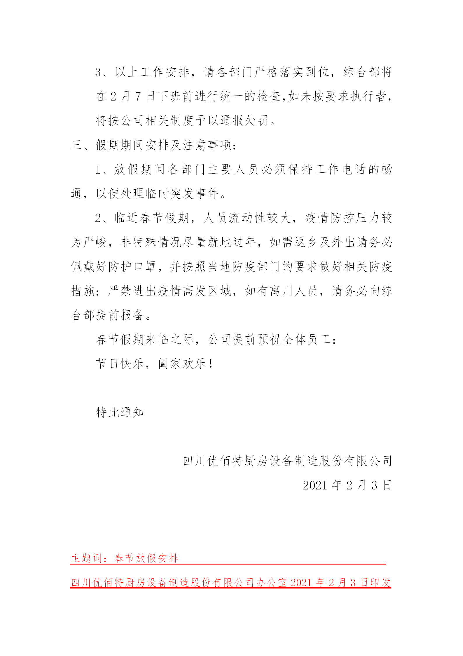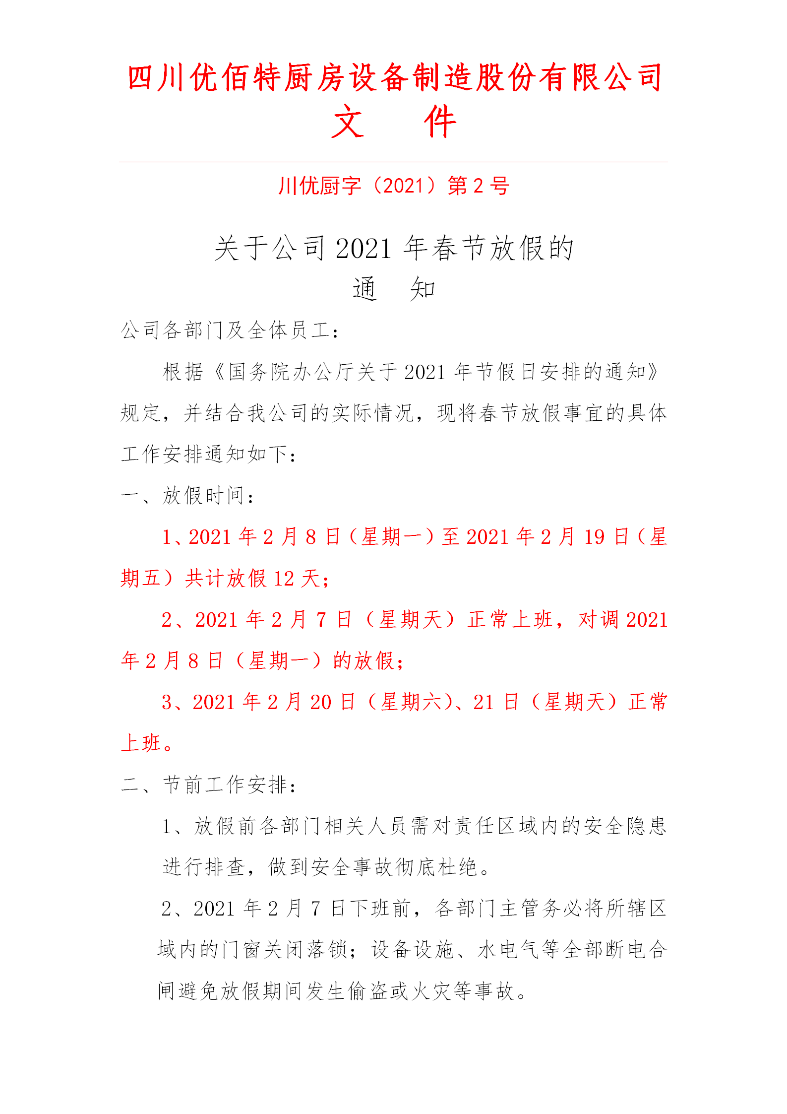 感谢你这一年来对华体会app注册登录入口的支持,春节假期将至,优佰特公司祝你和你的家人新春快乐,财源广进,万事如意。我公司根据《国务院办公厅关于2021年节假日安排通知》,并结合我公司实际情况,对春节放假做出如下安排: