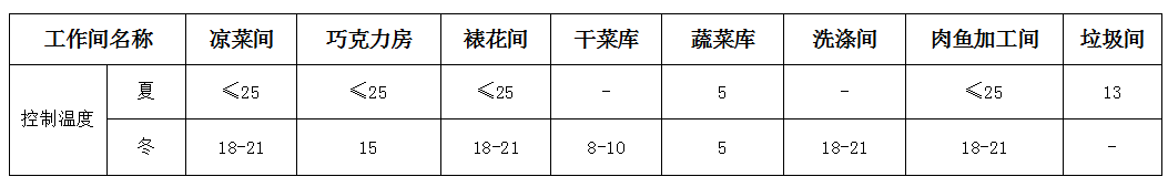 在规范中对工作专间有明确的定义:“指处理或短时间存放直接入口食品的专用操作间包括凉菜间、裱花间、备餐专间等。”我们这里的专间包含了其他专用工作间。各种专间温度控制参照规范的要求和一般做法。设计人员要结合实际提出设计要求,例如.大型食堂和快餐店,在就餐准备之前有大量的食材要加,特别是鱼、肉、禽、在室温下搁置较长时间,不能随时进行冷藏保鲜,夏季对室内的温度就要严格控制,或增加保鲜设备的容积、便于及时冷藏,防止经过浸泡、择洗、改刀的食材变质。严格控制各区温度和湿度是控制微生物生长、保证食品安全的关键。不同区域环境有不同的温度和湿度要求。主食库、调料库、干品库只要控制湿度,各加工区需要控制温度,见下表