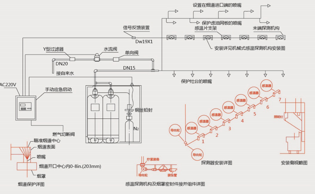 普通的灭火系统(水喷淋、气体等)是按建筑面积或保护区容积来确定系统的大小,而厨房设备灭火系统是按规范所指的被保护对象所需喷头的数量来确定系统的多少。目前,一套单瓶组自动灭火系统载荷的喷头数量不超过13个,感温易熔金属拉索释放器最多5只,灶台保护最大长度为6米,烟罩最大保护长度为6米;双瓶组自动灭火系统载荷的喷头数量不超过20个,灶台保护最大长度为12米,烟罩最大保护长度为12米。