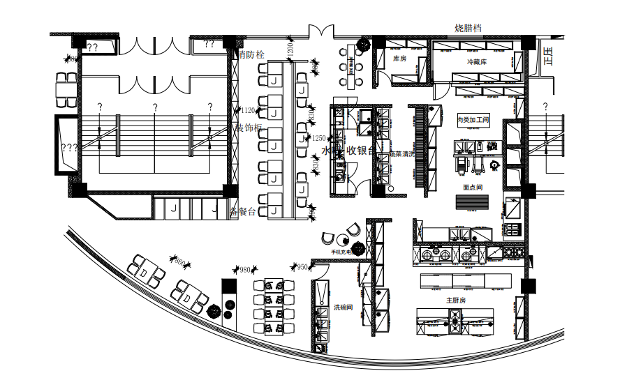 使用的灶具少,灶具主要是用大锅灶煮面、熬粥,只需一两眼炒灶用来制作主食配料,或用来煮零点的面条、饺子;使用的机械设备多,如和面机、压面机、包子机、菜焰机、搅拌机等;蒸、煮、烤、炸、煎设备用得多,蒸饭柜、夹层锅、烤箱、电炸 锅、电饼铛等;主食加工间与副食加工间特点不同,主食的米饭、馒头、包子、饺子等食品大多是批量制作,批量蒸煮生产。所以,除煎炸食品外,生制与熟制可以分开区域设置。熟制区需要出餐台,生制区需要机械设备、工作台、及原料运送,传餐通道要有一定的宽度,通道要设置合理。由于经营方式、餐品类别、加工工艺、出餐产量大小差异较大,主食加工间布局与饭店厨房设计自有特点。
