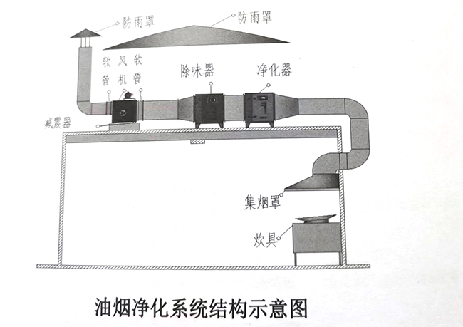 5. 风机的进、出风口必须加软管连接,风机必须加减震器,防止风机的噪音和震动传递到油烟净化器和管道,影响油烟净化器净化效果和造成噪音污染。