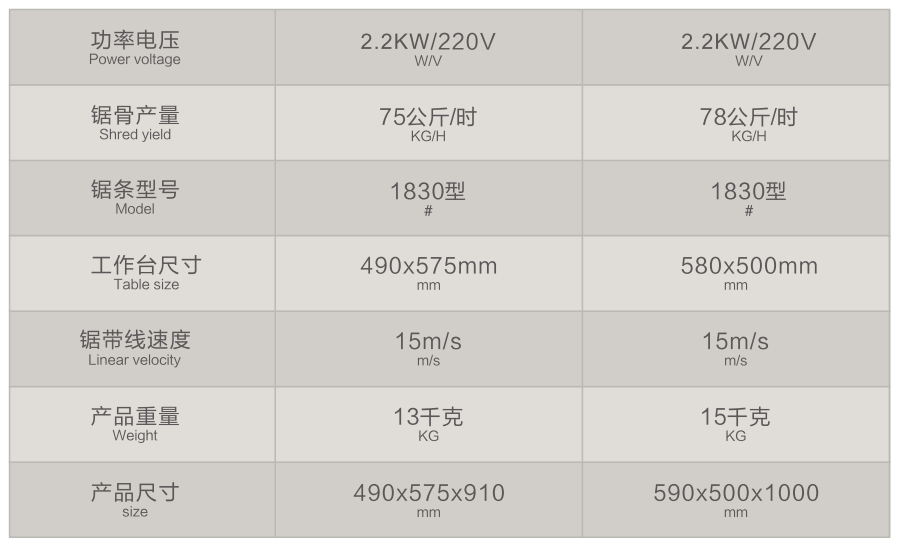 精装锯骨机外形简洁美观,结构设计合理人性化,操作简单。采用进口锯条,高强度高韧性,可以加工各种骨类、冻货类等产品。原料切割厚度可调,操作便捷,是各类食品加工企业、市场餐厅、学校、食堂等场所的最佳选择