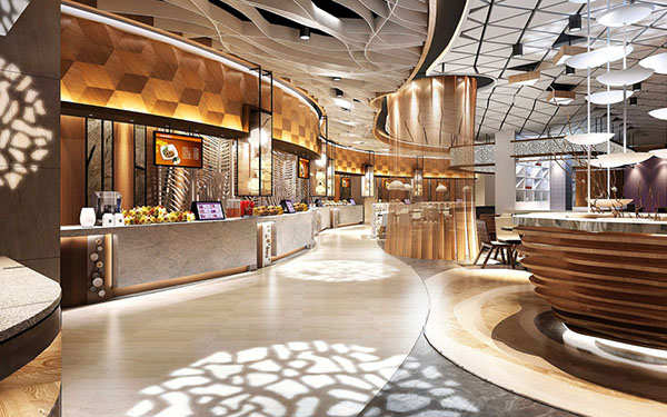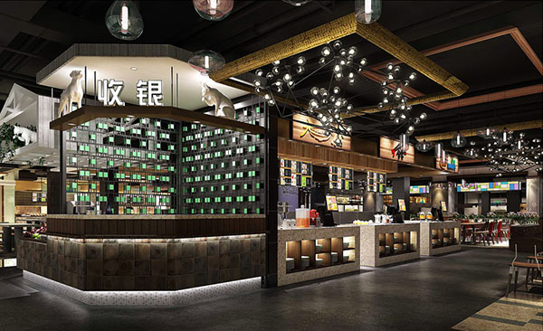 第三、在对美食广场的每个档口的设计时,应该考虑每个档口的面积不能过大,一般就10-20多平米左右,由于档口的面积较小,所以一定要做好档口厨房抽排系统的设计,需要安装统一的排烟管道,这样才能完全排除美食广场的油烟。