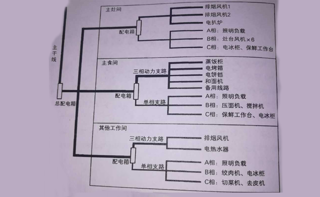 一般酒店的厨房供电系统用电负荷分为单相负荷和三相负荷。单相负荷主要为照明电源、单相插座以及其他额定电压为220V的电器供电。其特点为用电负荷的额定电压均为单相220V.若均匀分布到A、B、C三相,这类负荷也叫做相负荷。一般分为两个独立的系统:照明系统和22V单相负荷动力系统。380V三相负荷分别供电到各个工作间。额定电压为380V的动力支路主要供蒸饭柜、传菜电梯、电热开水器、排烟风