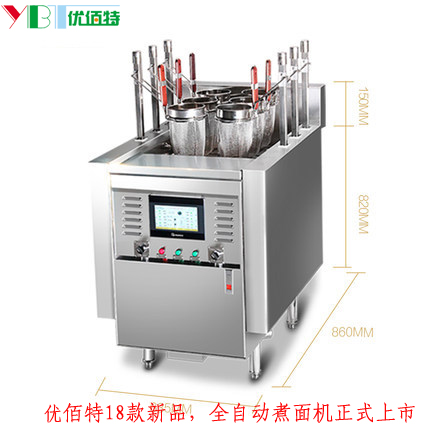 优佰特18款全自动煮面机采用全自动控制系统,六个煮面桶独立控制,可根据煮面的情况,自动升降,当把生面放进面框后,面框会自动下降。