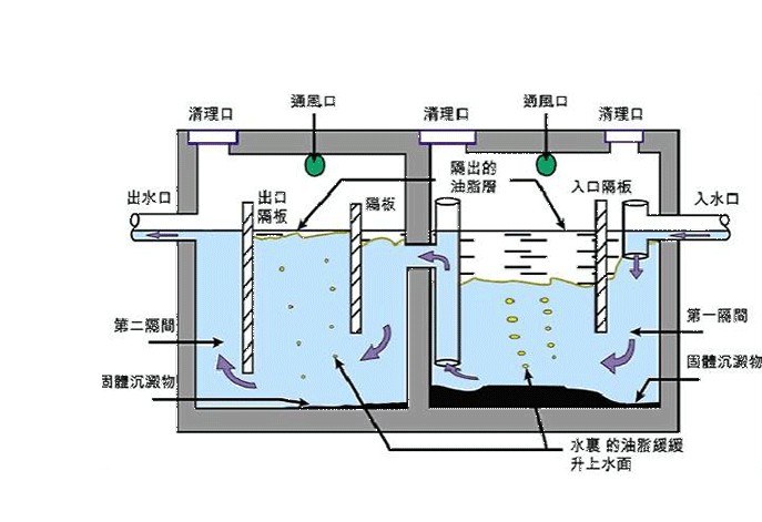 厨房隔油池也称为油水分离池,利用各种废弃物的密度、体积大小的不同特点加以分离。流程机理为:含有污油等废弃物的污水从排水管流入滤筛筐,先除去较大的菜叶、食物残渣等固态废弃物,泥沙、碎末等细小废弃物在沉降室进行沉淀,固液分离;污油浮于水面,隔油板阻挡浮油,经初级、次级、三级分离室进行大废弃物、小废弃物、油、水分离,清除易腐烂的有机固体和液体废弃物,使污水净化排放。浮油在隔离室的上部,大废弃物在滤筛筐中,沉淀物在池底,需要人工定期清理。